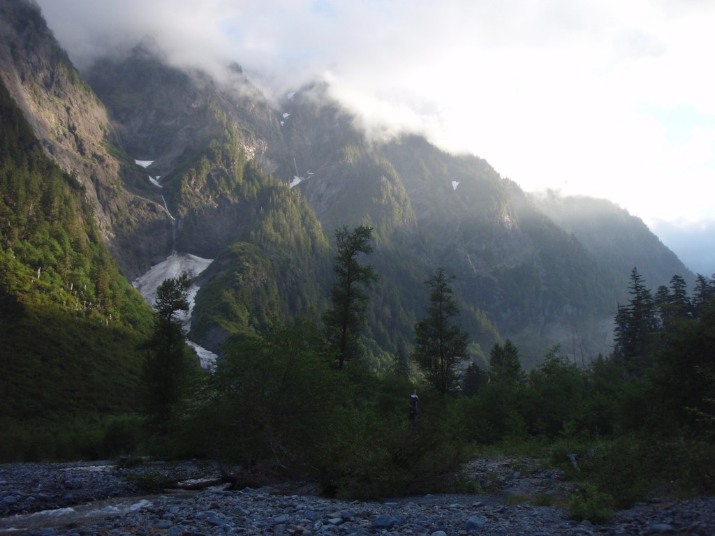 I suppose a correction is necessary here. It is not the rain that is comforting, but the satisfaction of staying warm and dry in spite of it. Most backpackers will at some point in their hiking careers encounter such challenges. One of my earliest nights in a rain shower occurred many years ago, before the days of light weight rip stop nylon and Gore-Tex. I had hiked to a mountain lake in an area that is now called the Alpine Lakes Wilderness Area, east of Seattle. The rain started shortly after I had set up my tent, a task that did not take long, for it consisted simply of lightweight plastic material that is held up in the front and back with two vertical poles, what used to be called a “pup tent.” I had bought it for thirty-five dollars at a local hardware store. It did not have a rain fly.