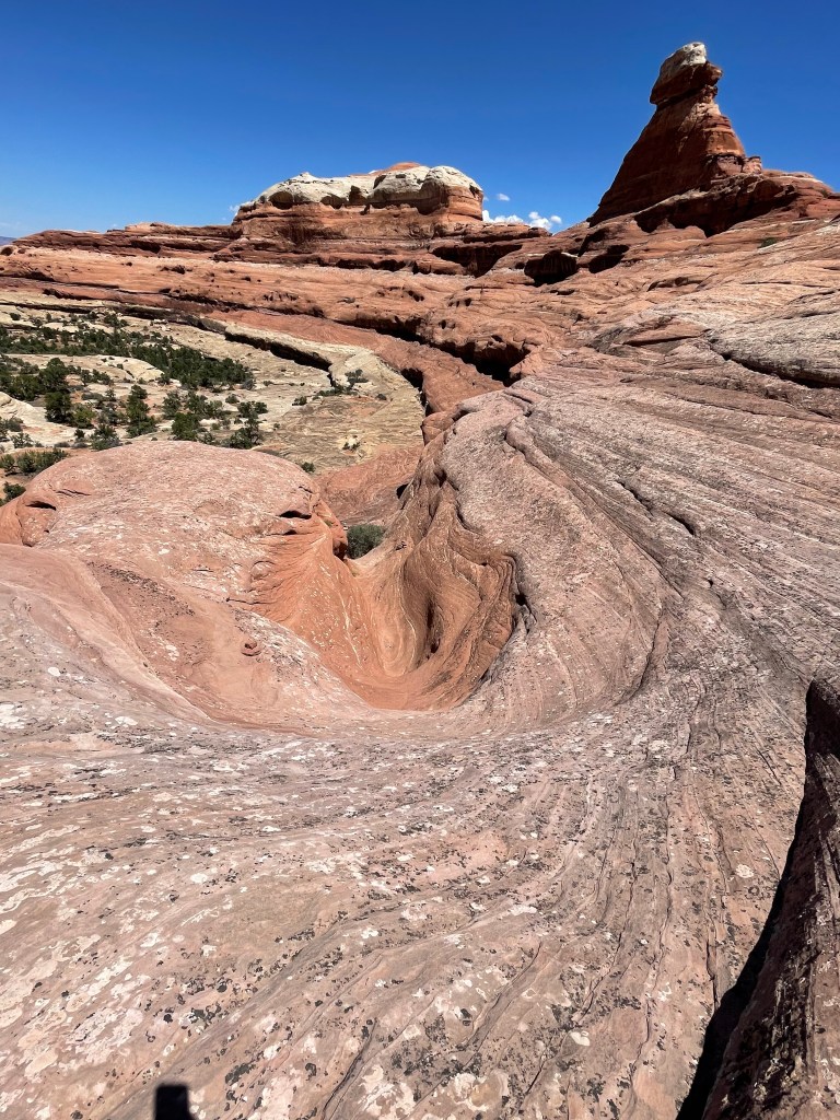 The route I had chosen started out by crossing sand with an occasional scramble over slick rock outcroppings. There was some shade, and when I found it I would pause and rest. Just like forcing myself to drink water, I would stop whether or not I felt like I needed to do so. Sometimes a cool breeze would blow underneath the juniper tree or the overhanging rock. It felt like a precious gift. I would press my body against the rock and savor the marvel of coolness. The experience became a kind of meditation for me as I continued my hike. “Pause and rest” became my mantra.