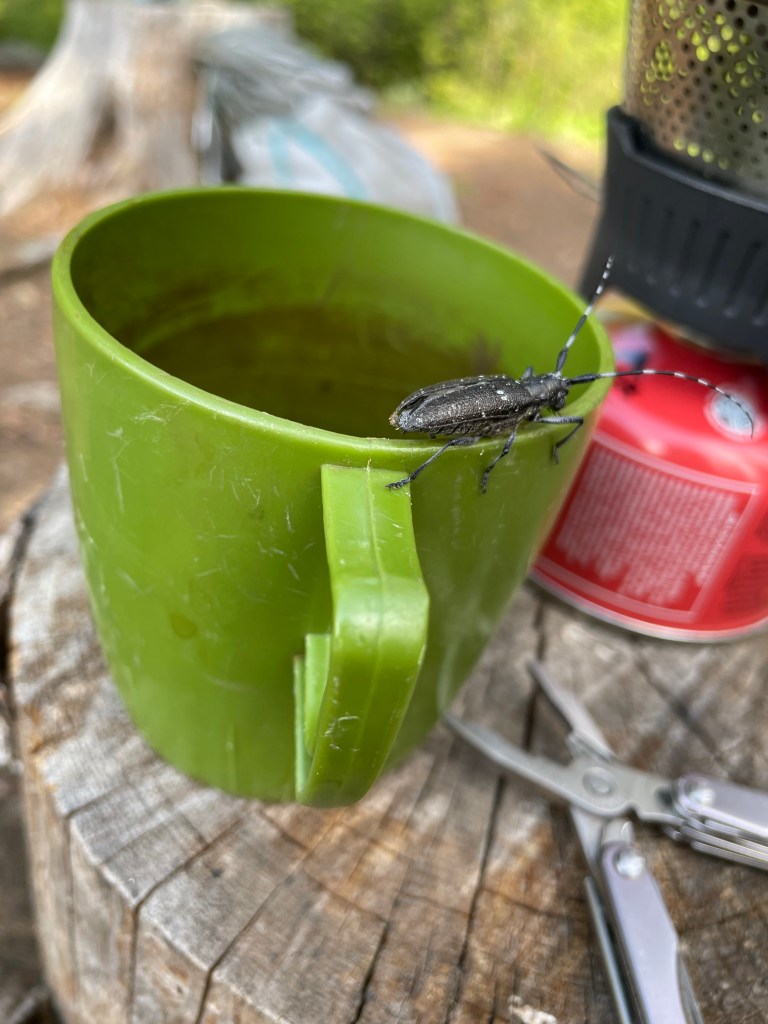I never saw Mary Pat again. If I had I would have thanked her for the treasure that has been with me for so many years. It has become a constant companion, always in my backpack and placed so that I could retrieve it with ease and look up whatever caught my attention on the trail. Sometimes in camp I would pick it up and thumb through the pages until I landed upon an interesting topic. Even the weather was included, so I would look up at the sky or down at the ground at the small things which are always there, crawling about my feet or sometimes on the rim of my teacup, like the white spotted sawyer beetle you see in the photo above.