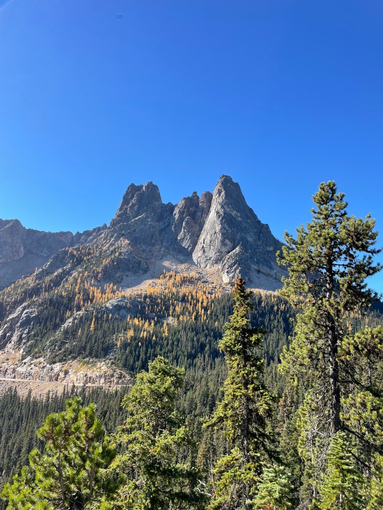 Take the photo you see above, which is Liberty Bell Peak. In my various photo collections I have views of Liberty Bell shrouded in low clouds, shinning in the sunlight, and in this one ablaze with the golden needles of subalpine larch trees in fall. On the side of the road there are usually several cars parked, as climbers make their way to the summit at 7720 feet in elevation. It is considered by climbing organizations to be one of the fifty best climbs in North America.