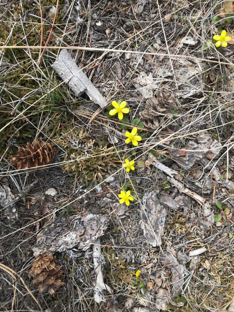 We all have our own pandemic stories to tell. This is mine. It is not so bad. It involves tiny yellow flowers in bloom and is a reminder that no matter how bleak the world may seem at times, things get better. I first noticed the flowers when I was outside hanging laundry on one our first sunny days in early April. I had spent most of the winter indoors, hardly leaving the house except to go grocery shopping about once a week. I had not been able to visit my daughters in western Washington, for the COVID outbreak was widespread there while still quite limited in my isolated community. I was looking for any excuse to get outside, and hanging the sheets out to dry on a sunny day seemed like a good one. As I reached down for the laundry basket the yellow flowers were visible on the sodden ground amid last fall’s pine needles and the rivulets of melting snow.