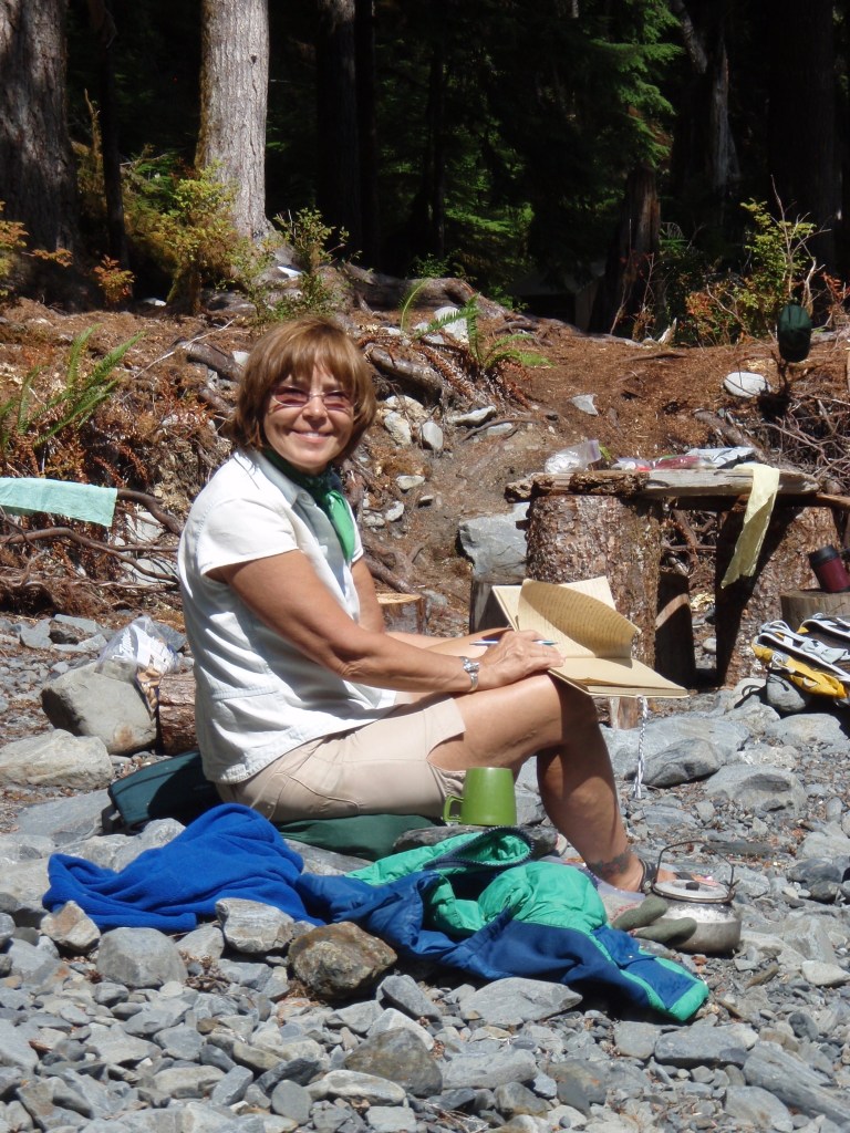 In the photo above I am smiling because the sun was shining. It lasted for about fifteen minutes, and for the rest of that four day trip it rained most of the time. My husband and I were hiking in the Olympic Rain Forest, so the weather was not totally unexpected, but it nevertheless was a rather challenging trip, beginning with the first night when it rained hard all night long, and our old tent leaked. The following day we packed up our soggy camp and continued up the trail towards the Low Divide. When we arrived in camp and began to unpack I discovered that the water reservoir in my pack had leaked and soaked my sleeping bag. It was more than just a little damp. I had to wring it out and watched the water stream onto the ground as I did so.