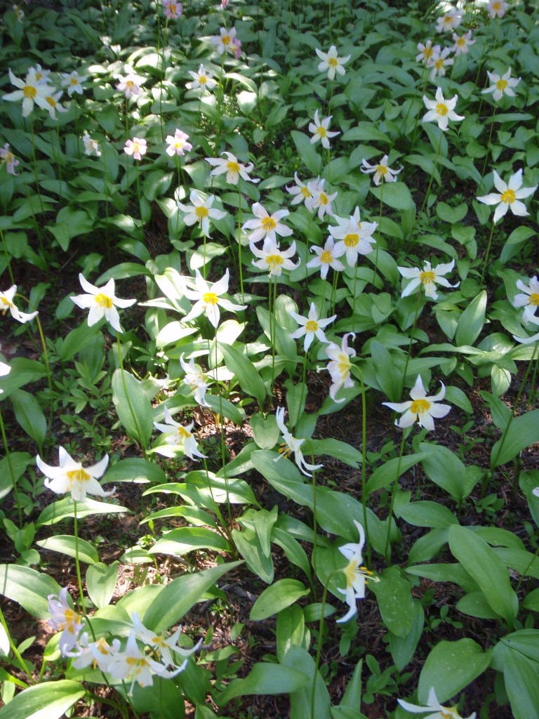 One such memory is of Home Sweet Home Basin in Olympic National Park. This trip took place many years ago when I was new to solo hiking. If my memory serves me correctly I was twenty-three-years-old, a young woman finding my way in the world, finding my way on the trail while heavy snow still remained in the high country of those mountains in that summer following a heavy winter snowfall. I had made the long ascent up the Skokomish River Valley to the divide that marks the transition to the Duckabush River watershed. From that point the trail was not visible beneath the snow, but I could see the shelter below in Home Sweet Home Basin, still sturdy and strong in those days, and I had no trouble finding my way down the steep slope. The basin was covered with a large snowfield, but at its edges was perhaps the greatest profusion of wildflowers I have ever seen, as if they could not wait to start blooming as soon as they were able to lift their flowering heads above the melting snow: avalanche lilies, glacier lilies, and marsh marigolds which bloomed in the trickling water from the melting snowfield, the beginnings of the Duckabush River.