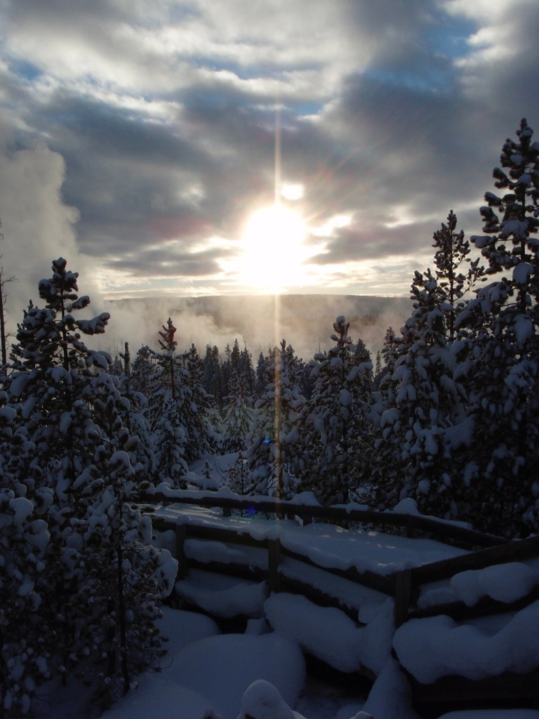 Not all the beautiful places I cherish have been viewed from a trail. The photo you see above is of the Norris Geyser Basin in Yellowstone National Park. The park is magical in the winter time, as the hot steam rises from springs and geysers and melts the snow, creating grazing for elk and bison and hoarfrost on the surrounding trees. The world sparkles, and at dusk when that photo was taken it softens into a play of shadow and light. Yellowstone is full of wonder any time of year, but the winter time is when it sparkles.